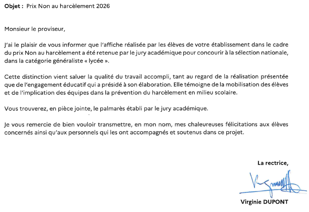 L'affiche réalisée par les ambassadeurs contre le harcèlement a retenu l'attention du jury académique. Nous poursuivons la compétition au niveau national !