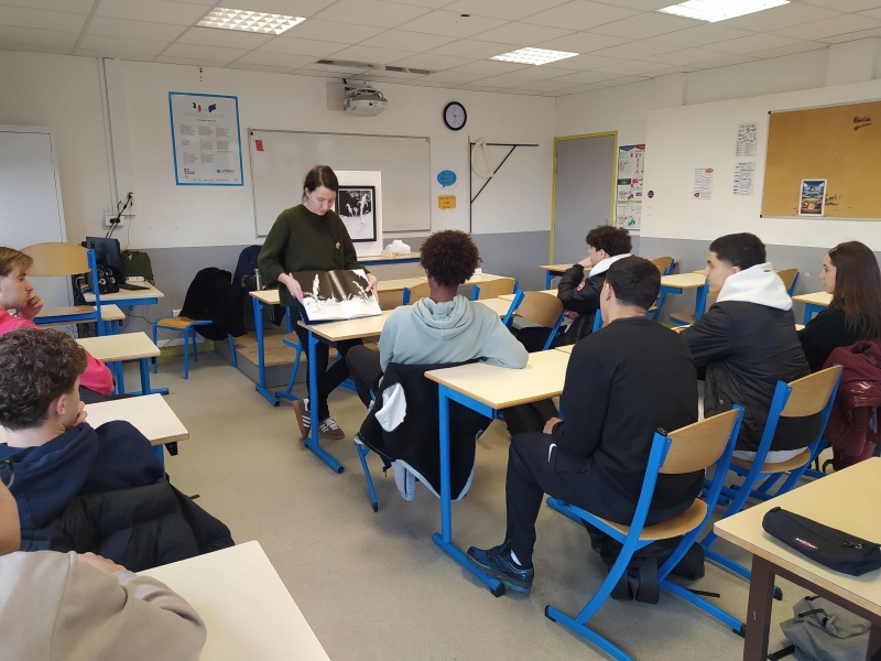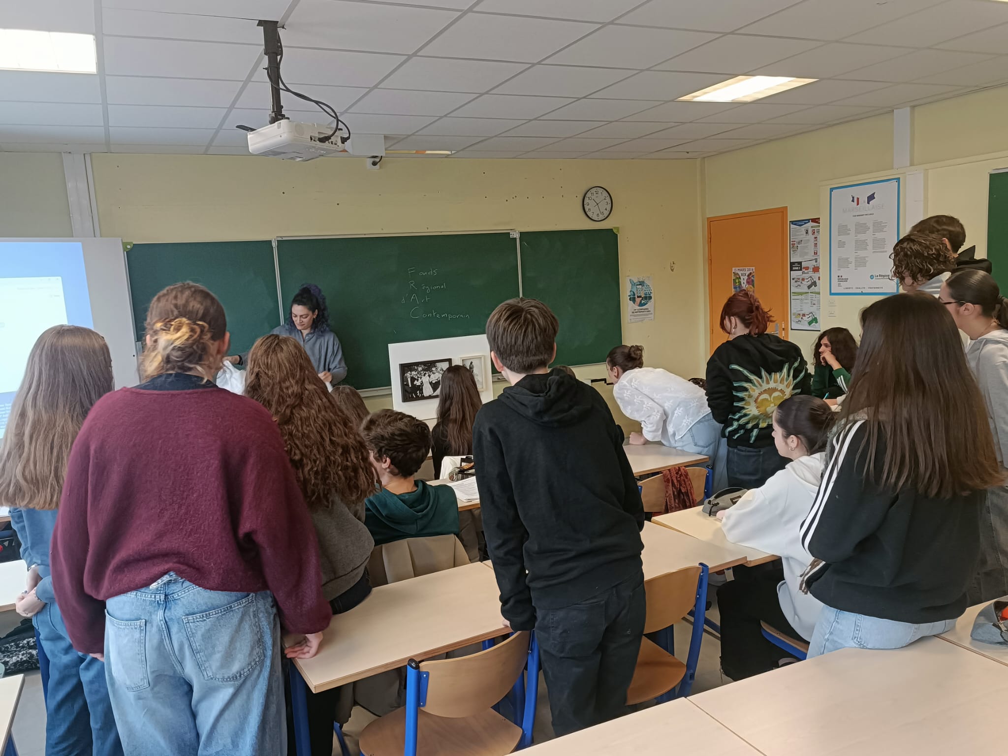 Ce vendredi 23 février les élèves de 2nde 1, 2nde TRPM-MP3D, 2nde TNE et 1ère HLP ont rencontré les médiatrices du FRAC Auvergne. Chaque classe a bénéficié de la présentation d'une oeuvre du fonds régional d'art contemporain : ibération 2 - Série Incidental Gestures, 2011 d'Agnès Geoggray et Random - 2008 d'Abdelkader Benchama.