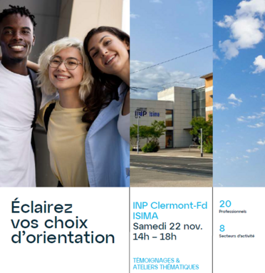 En effet, en partenariat avec L'association « Les Entretiens de l'Excellence (EE) » – agréée par une convention nationale avec le Ministère de l'Éducation nationale et de la Jeunesse – nous vous proposons d'être accompagné dans la construction de votre projet professionnel en vous permettant de rencontrer des intervenants, le samedi 22 novembre 2025, de 14h à 18h, dans les locaux de l'INP CLERMONT - ISIMA (Campus Universitaire des Cézeaux), à travers des ateliers thématiques. Grâce aux échanges avec des professionnels issus d'entreprises, de start-up ou encore d'institutions, vous aurez un contact avec le monde du travail et vous pourrez ainsi mieux orienter vos choix d'études supérieures.