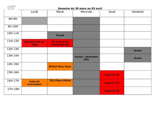 Planning du CDI semaine du 30 mars au 3 avril 2026