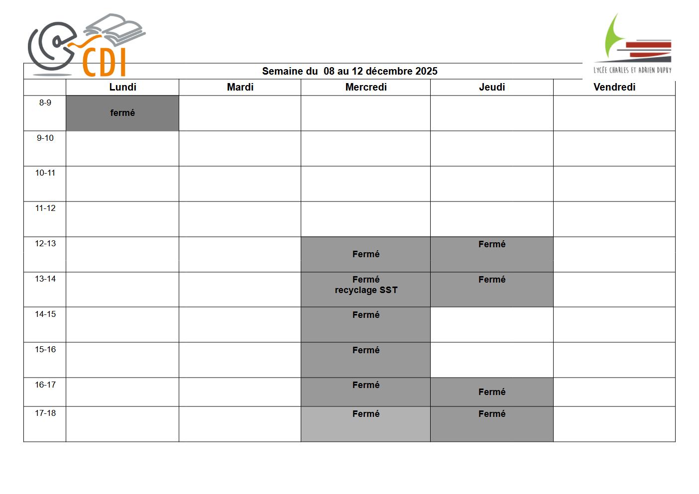 Planning du CDI semaine du 8 au 12 décembre 2025
