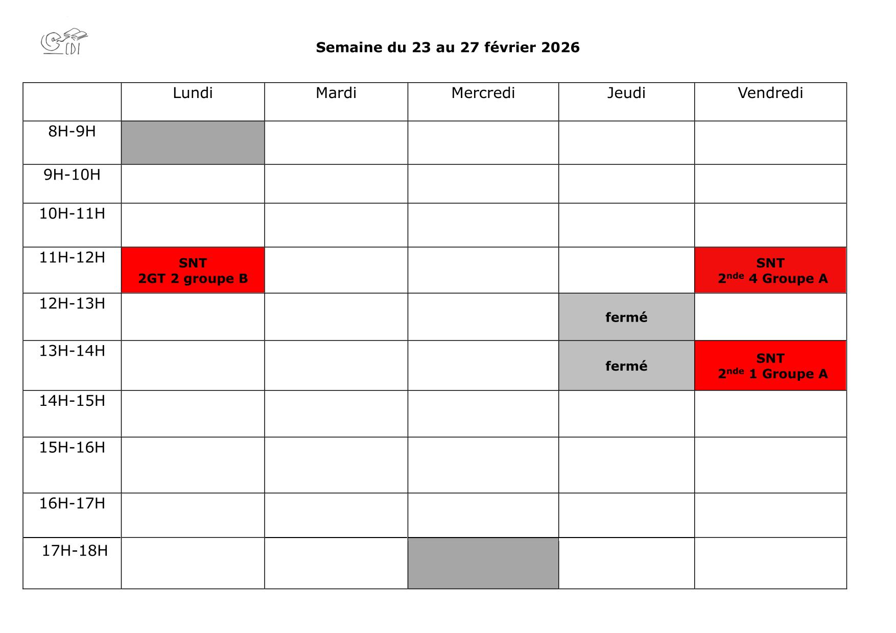 Planning du CDI semaine du 23 au 27 février 2026